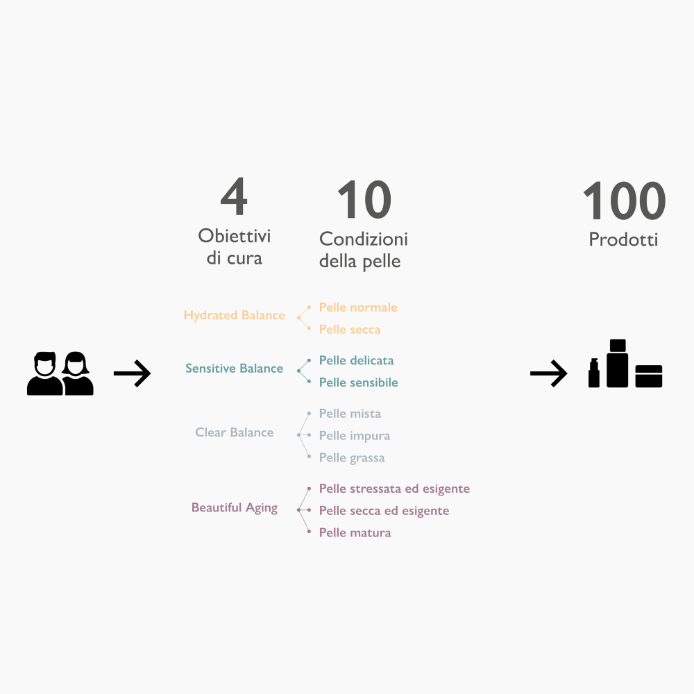 Grazie alla guida è facile e veloce trovare i prodotti ideali per uno specifico obiettivo di cura o per una specifica condizione della pelle.